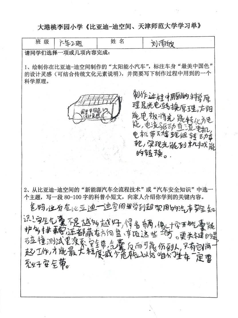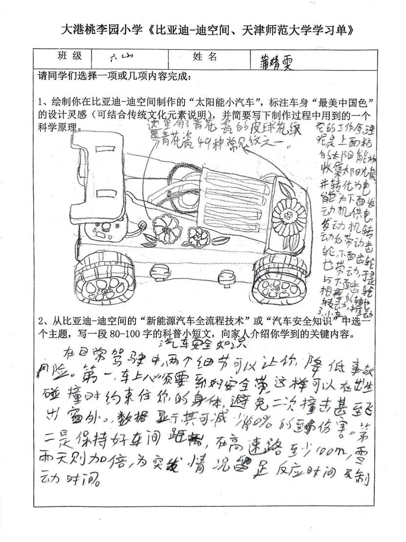 翻开同学们的记录单与学习单,满是惊喜:有的记下汽车安全知识,把研学收获变成实用科普;还有的梳理师大建筑故事,让学术向往落于笔端;有的手绘 “青花太阳能小车”,将传统美学与科技原理巧妙结合。这些稚嫩却认真的文字与图画,正是 “科技小先生” 成长的最佳见证。